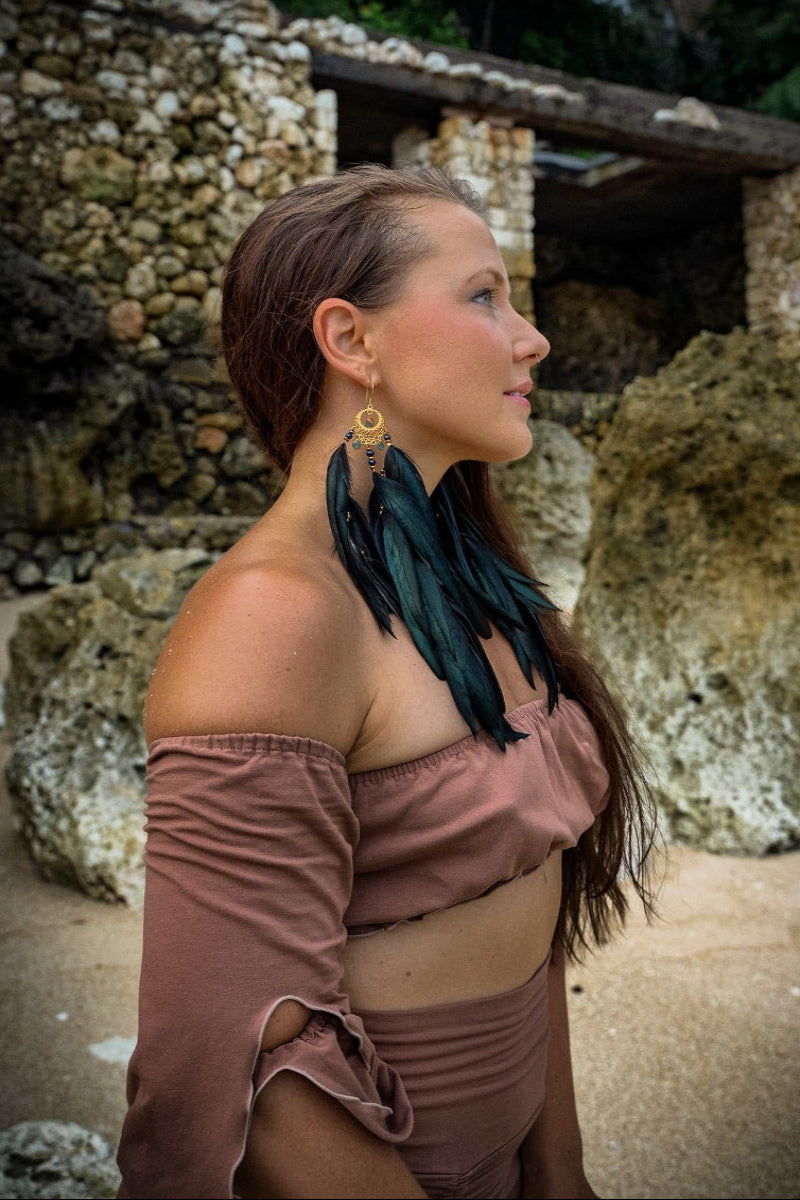 Crafted from rich black-green emerald feathers on a black string, adorned with a gold-plated brass moon chandelier, golden and black beads, gold-plated sterling silver hooks, and radiant labradorite crystals.