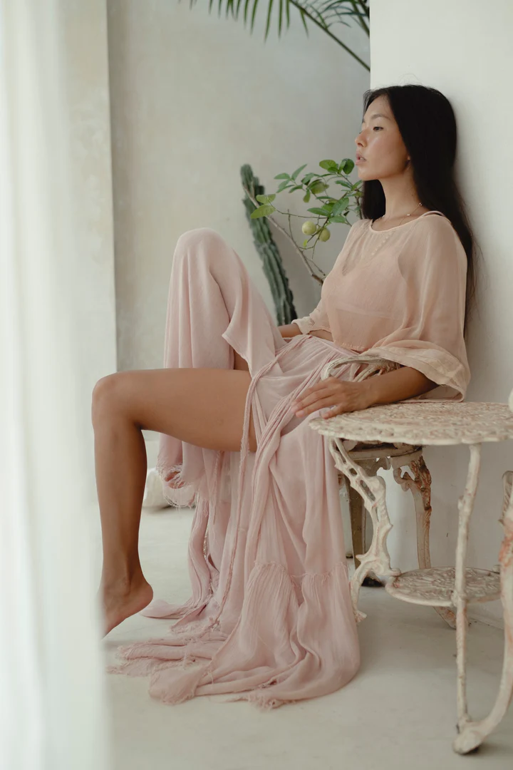 Its versatile design allows it to be worn as a chic crop top over dresses or styled as a standalone piece. Adjustable waist buttons offer a customizable fit, while loose, flowing sleeves enhance movement and create a naturally graceful silhouette. Each detail, from the hand-finished edges to the airy drape, reflects the artistry of slow fashion and mindful craftsmanship.